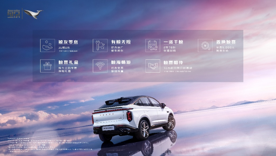 消费者通过上汽荣威APP、小程序先享订购鲸,仅需2000元订金,可获得包括36期0息、终身原厂整车质保、2年78折保值回购、至高5000元置换补贴、终身免费基础流量等“鲸喜七联”。
