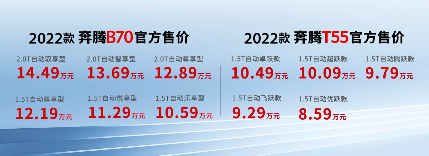 其中,2022款奔腾B70精简至6款车型,官方售价10.59-14.49万元,新增智能配置高达14项,同时加推2.0T入门车型,大幅拉低2.0T家轿购买门槛。2022款奔腾T55共5款车型,官方售价从此前的10万级下探至8.59-10.49万元,以紧凑型SUV身份对小型SUV 市场形成“降维打击”。两款新车均提供一汽奔腾惊喜加码的“购置税全免、再送商业险”购车政策,拉近用户与国民好车的距离,与新升代用户共克时艰。