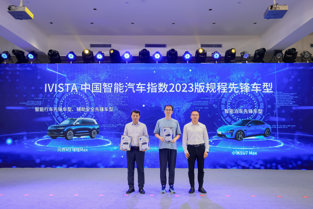 中国汽研信息智能事业部副总经理、中国智能汽车指数负责人张强发布IVISTA中国智能汽车指数2023版规程先锋首测车型的成绩并为参与首测的车型颁奖,问界M9增程 Max同时获得“智能行车先锋车型”及“辅助安全先锋车型”称号,小米SU7 Max获得“智能泊车先锋车型”称号。此外,依据IVISTA中国智能汽车指数2020版规程测评结果,深蓝 SL03i、极狐阿尔法S、蔚来ES7、智己LS7、欧拉闪电猫、小鹏G6获得纯电推荐车型(测评总分前六);长安UNI-V、理想L9、魏派摩卡、别克世纪、比亚迪护卫舰07、哪吒S获得燃油&混动推荐车型(测评总分前六),阿维塔11获得导航智能驾驶推荐车型(导航智驾NP测试排名第一)。