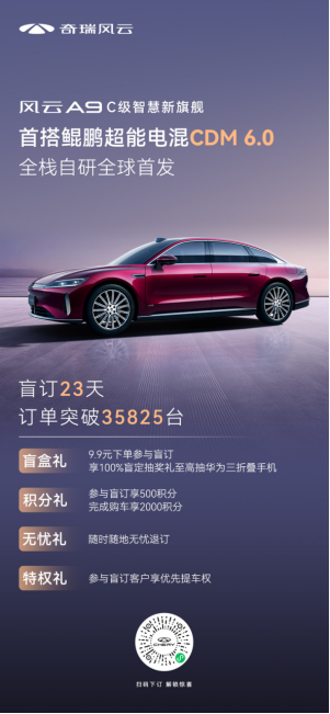 风云A9盲订持续火爆的背后,是其卓越技术、极致安全、豪华配置等硬核实力的表现,更是奇瑞技术积淀与创新的集中展现。奇瑞坚持的全球标准与极限测试,铸就了风云A9的卓越品质与全场景可靠性。依托全球八大研发中心与科学家天团,风云A9不仅重新定义了C级混动旗舰标准,更彰显了中国汽车工业的巅峰实力。相信风云A9上市后将会有更优秀的市场表现,助力奇瑞在全球新能源赛道上加速领跑。