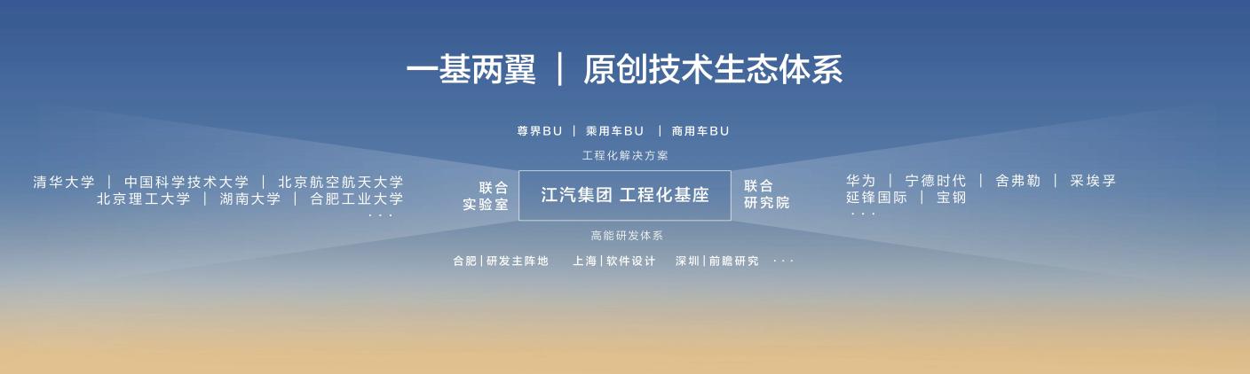 江汽集团积极携手顶尖院士团队、高校科研院所,聚力把最前沿的技术构想,变成可触摸的技术现实,并将持续深化开放合作战略,携手全球顶尖合作伙伴,进一步强化“一基两翼”开放式原创技术生态体系。